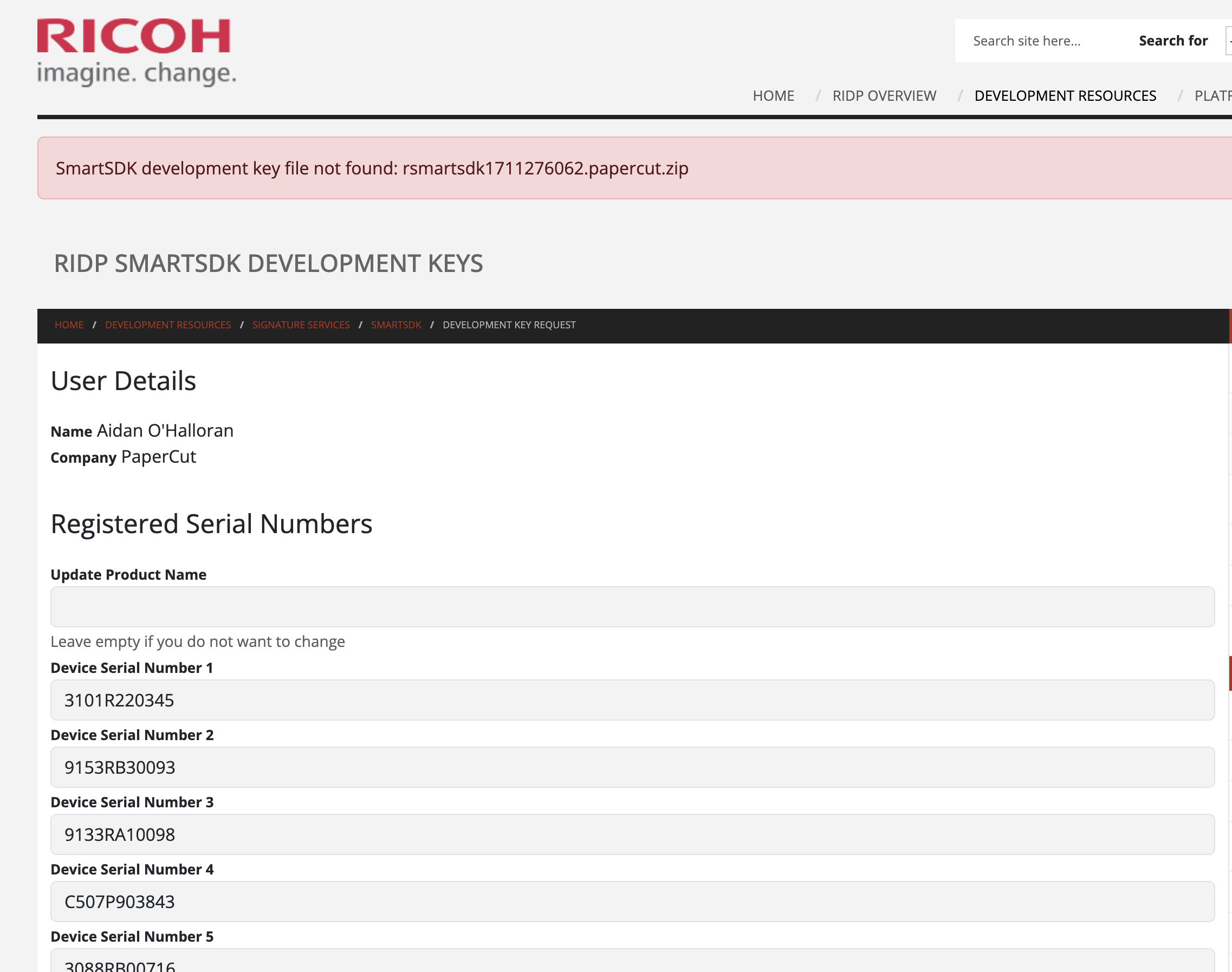 We are trying to add developement key for a new ricoh device.We can add the serial number and create keys but when we click on the download button it shows an error file not found.Attaching a screen shot below.